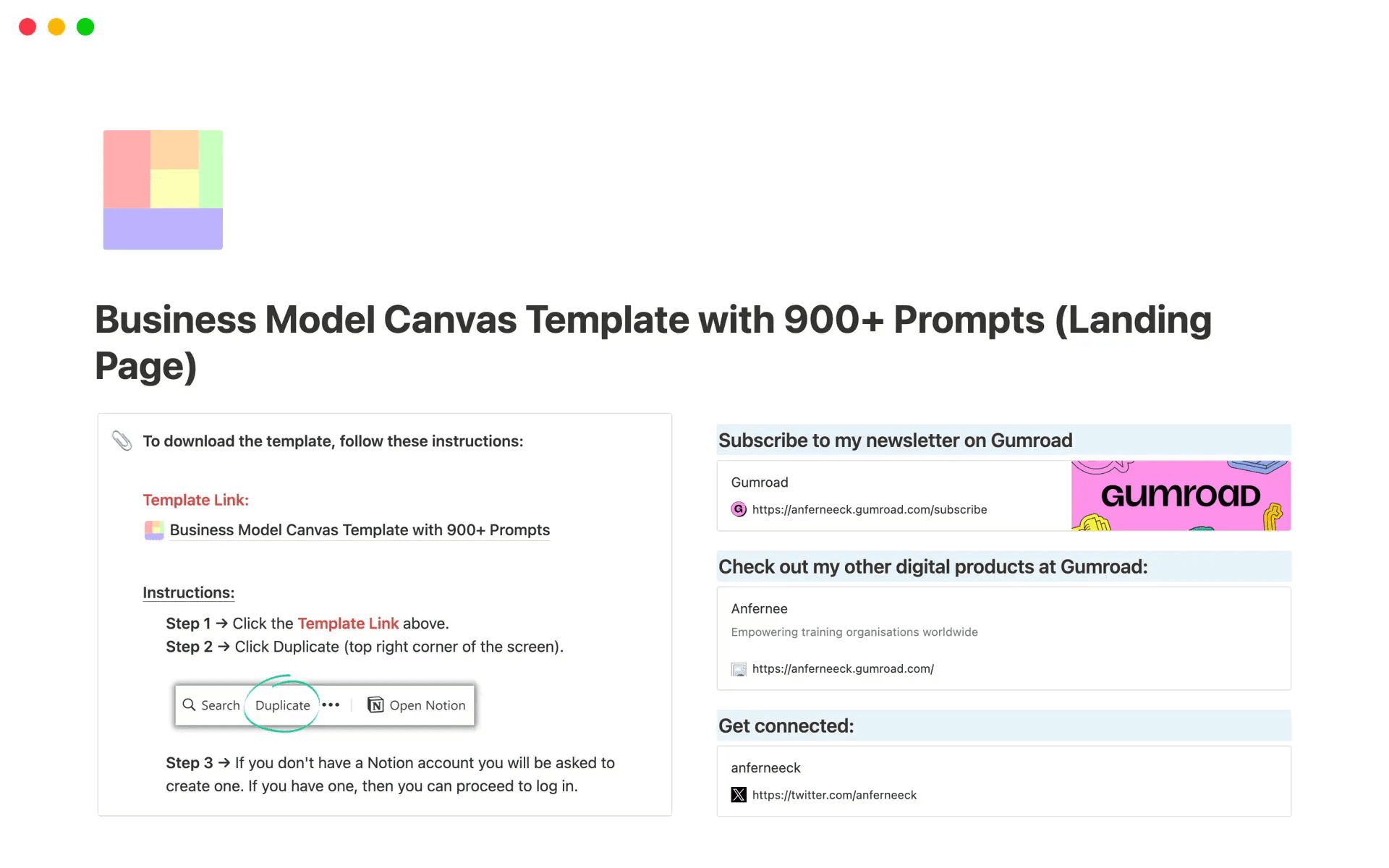 Refine your business strategy with the Notion Business Model Canvas template. This tool includes: