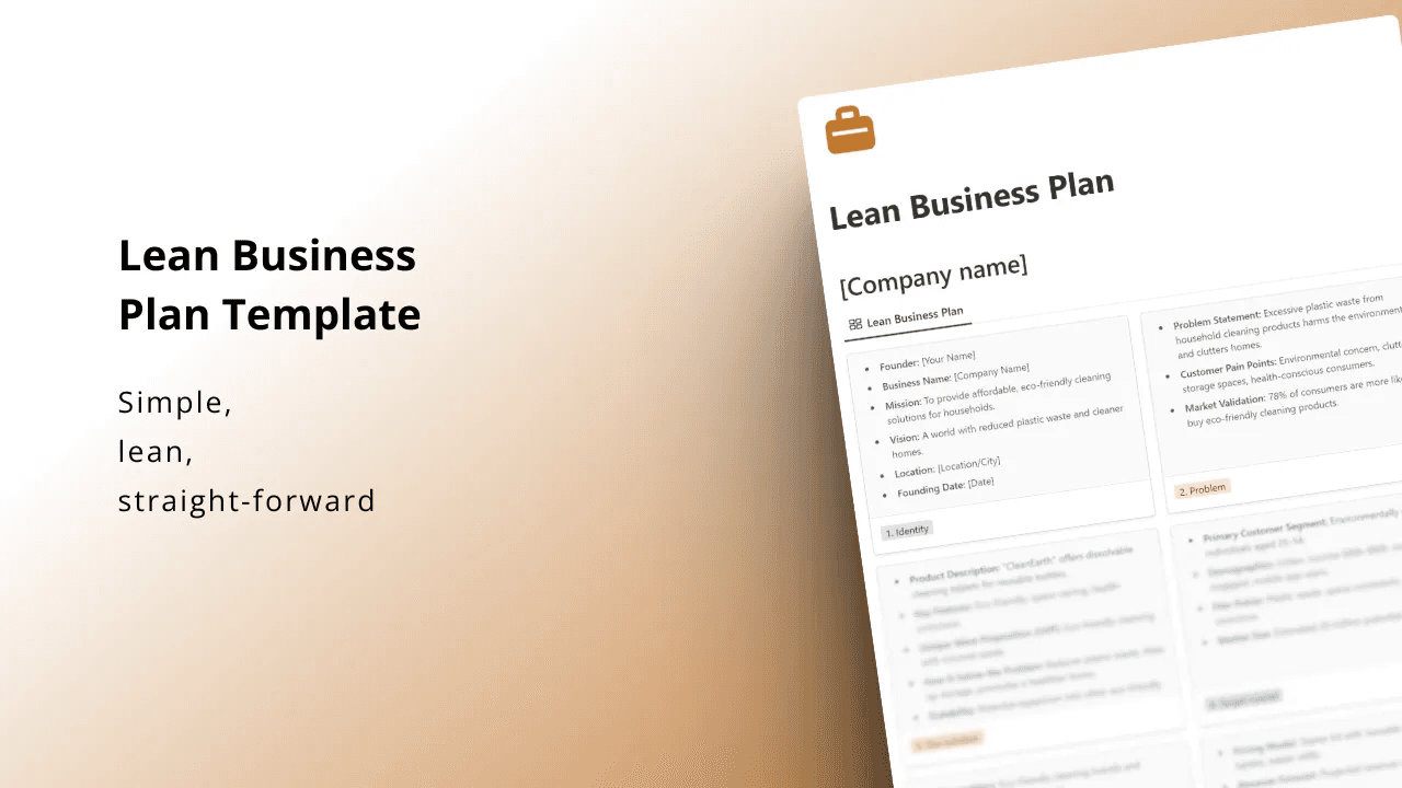 The Lean Business Plan for Notion is the fastest way to draft a professional business plan. This template removes the complexity and gives you a practical, structured format to define your business strategy.