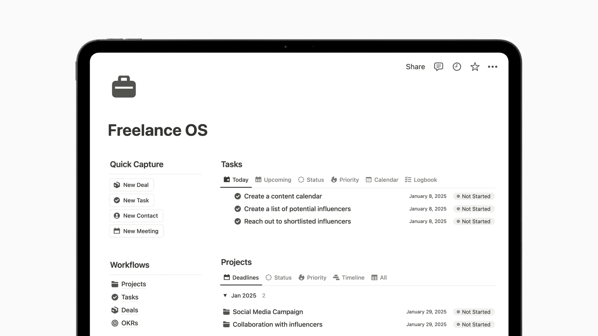 Whether you’re a freelancer streamlining your workflow, a startup founder launching your next big idea, or a manager overseeing a growing team, there’s a Notion workspace here to match your business needs and goals.