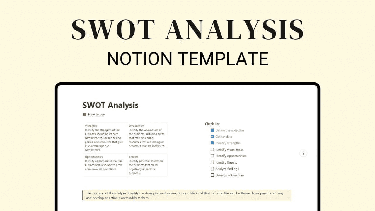Conduct a strategic deep dive into your business using the Notion SWOT Analysis Template. This tool helps you evaluate your strengths, weaknesses, opportunities, and threats in a clear and organized way. It simplifies the entire analysis process and supports better strategic decision-making.