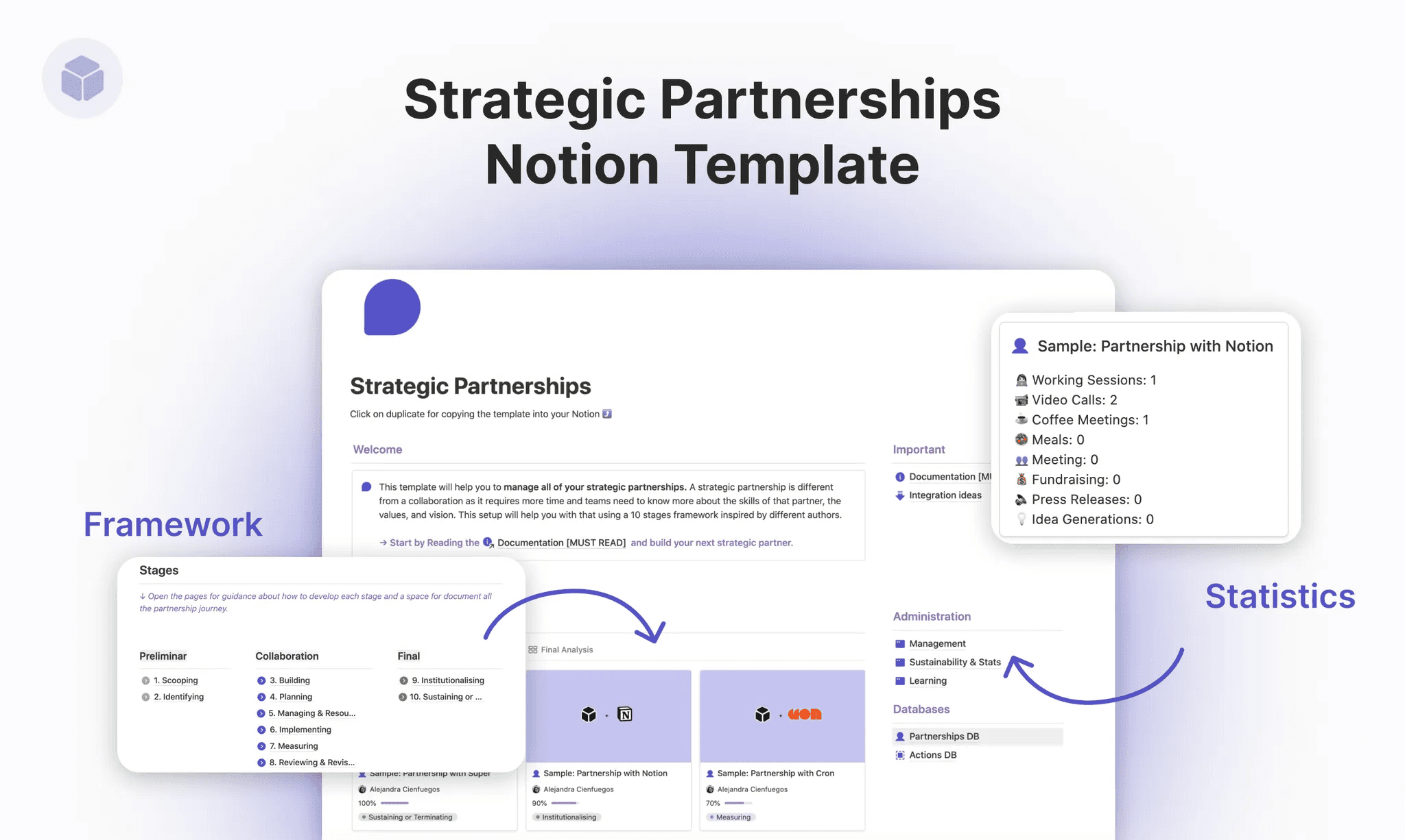 Build and manage successful partnerships with this Notion Strategic Partnerships template. Track ongoing collaborations, document key interactions, and implement a 10-stage framework for strategic growth.