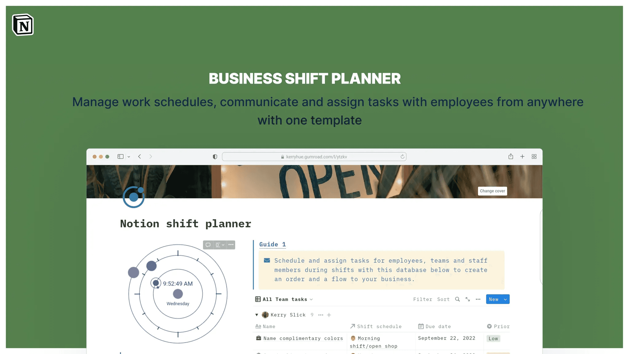 The Business Shift Planner for Notion is designed for businesses that operate on rotating shifts or flexible scheduling. This template offers a complete employee scheduling and shift management system that eliminates the need for paper notes and clunky scheduling apps.