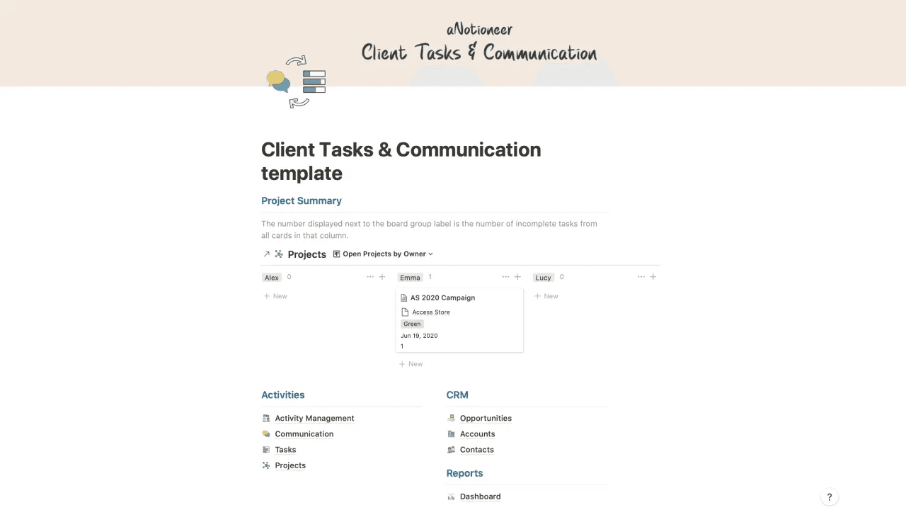 Simplify client task management and communication with this intuitive Notion template. Get a clear overview of project progress, deadlines, and overdue tasks. Easily integrate it with your CRM for a complete client management system.