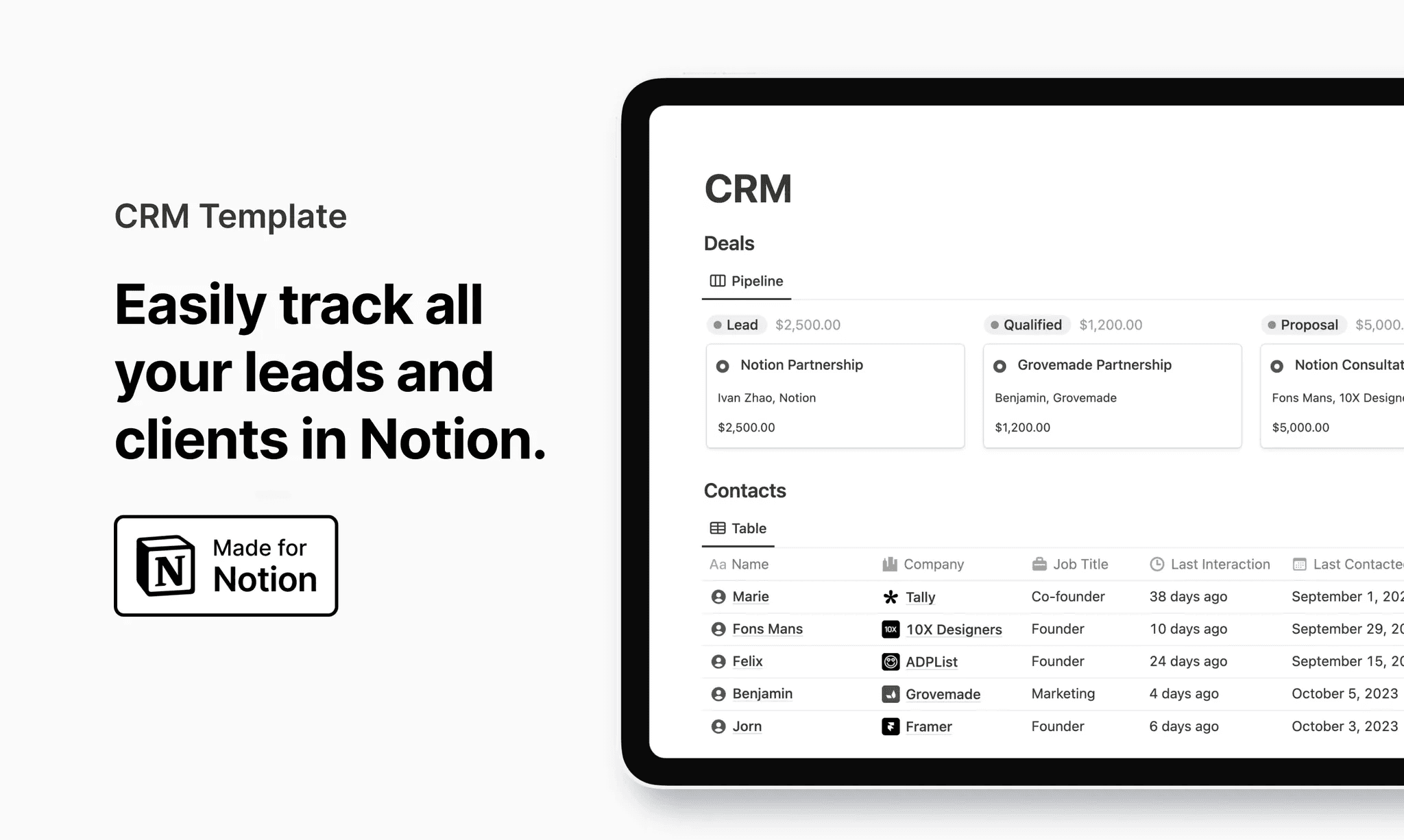 If you’re looking for a no-fuss CRM tool to manage your workflow, this one fits right into your Notion system.