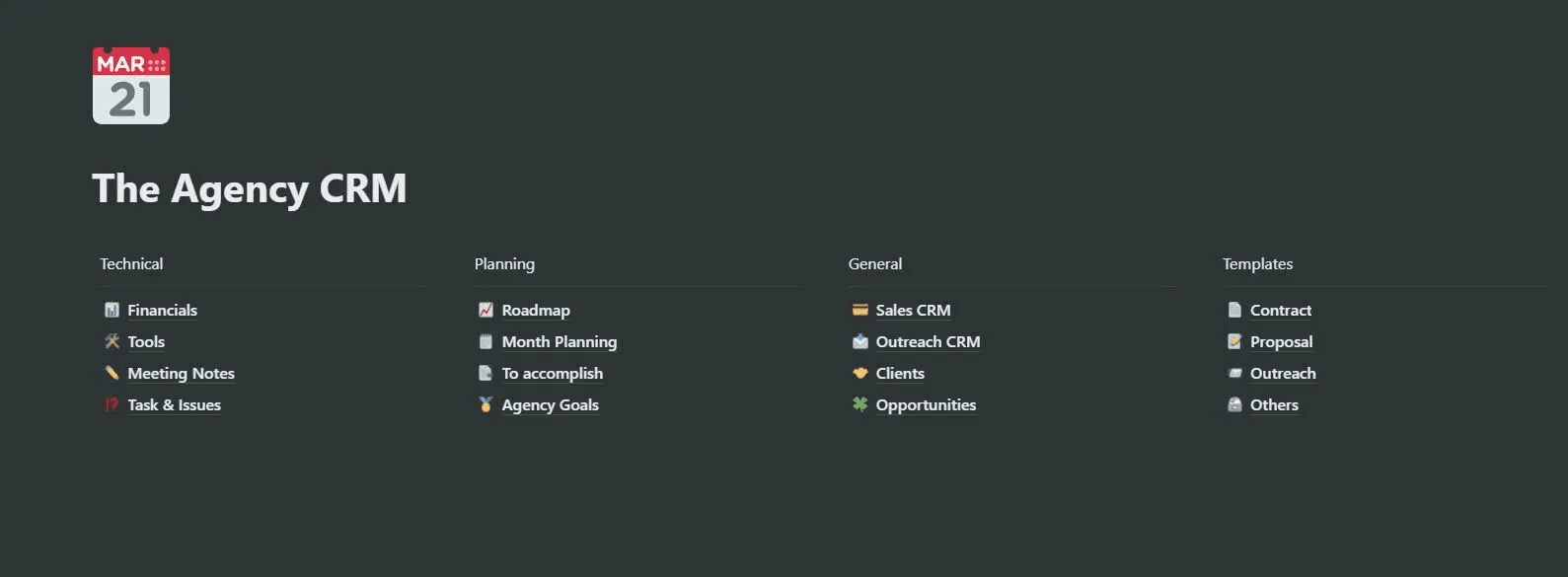 The Agency CRM Template for Notion is a free operating system designed for digital agencies and small creative teams. It provides a clear overview of your outreach, sales efforts, and operational planning—making it easier to scale and manage client relationships.