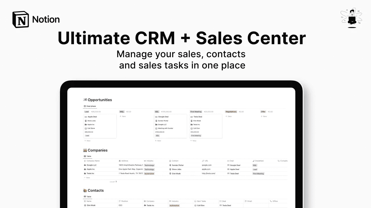 Whether you run a growing startup or manage client relationships as a freelancer, this CRM template helps you manage companies, people, meetings, products, and sales pipelines—all in one centralized Notion workspace. It’s especially useful for business owners looking to integrate other Notion systems, like project trackers or to-do lists, into a cohesive setup. Perfect for those just starting out or on a budget without a large sales team.