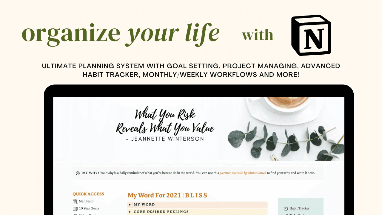 Take full control of your life and productivity with the Notion Life Dashboard—a beautifully designed all-in-one life management system built within Notion. This dashboard empowers you to organize your entire life in one centralized workspace, helping you balance your daily routines, long-term goals, personal habits, and more.