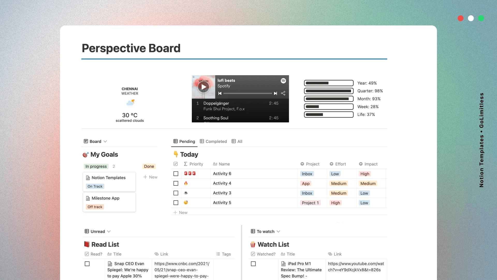Gain clarity and focus with the Notion Perspective Board—a dashboard designed to help you plan your day, track goals, and stay motivated through visual widgets and productivity tools.