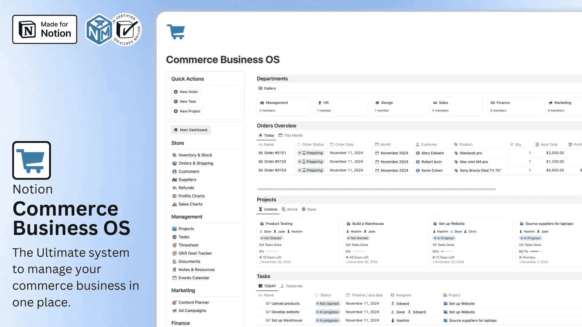 Run a successful online or retail business with Notion Commerce Business OS. This powerful Notion template is designed to streamline inventory tracking, order management, supplier coordination, and financial reporting.