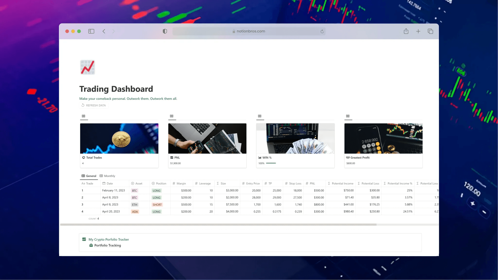 Level up your trading strategy with the Notion Trading Dashboard, an all-in-one template crafted for traders who want to monitor, analyze, and optimize their investment decisions with precision. Ditch the spreadsheets and embrace an intuitive dashboard that puts real-time trading insights at your fingertips.