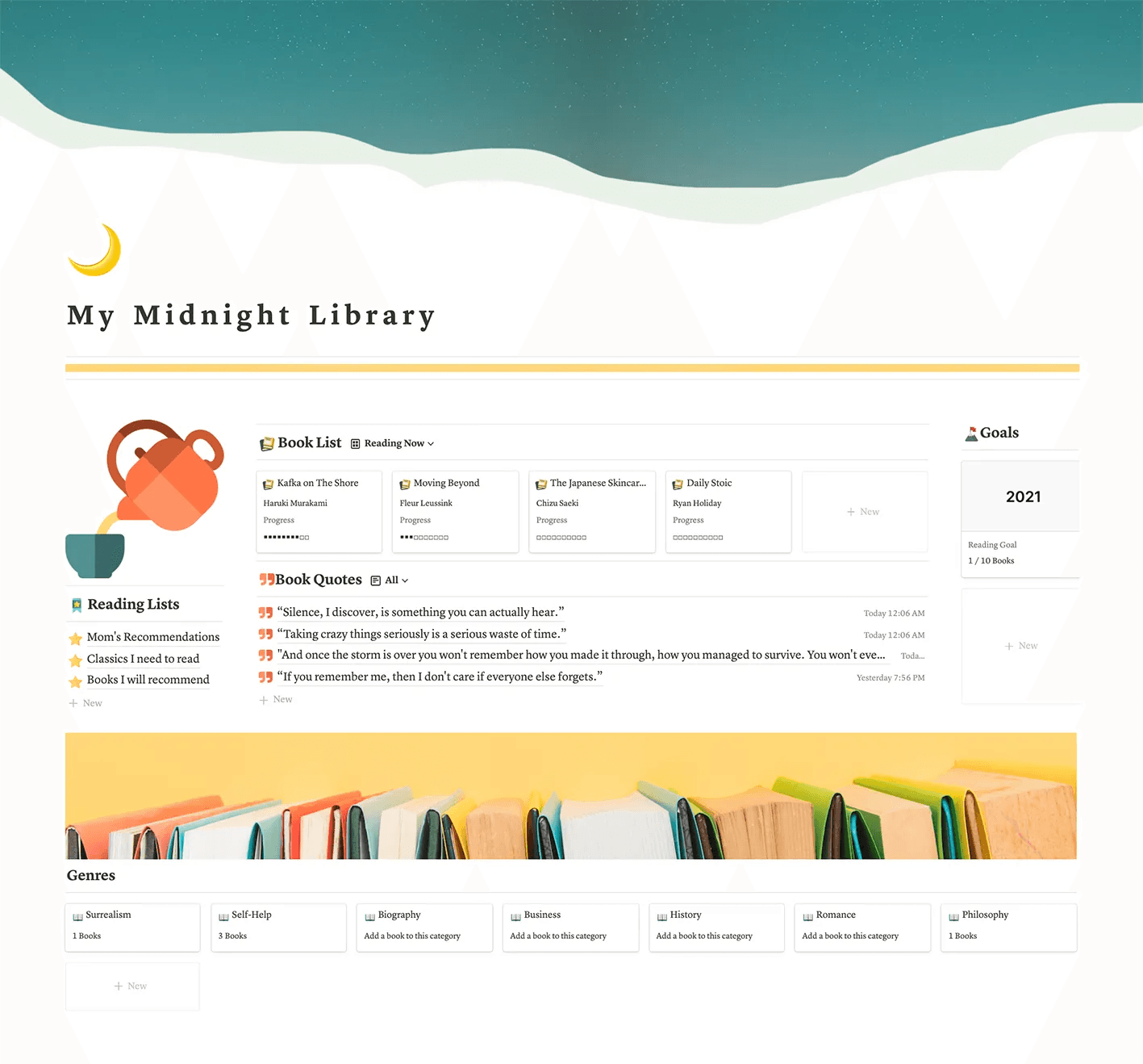 Inspired by Matt Haig’s The Midnight Library, this Notion Book Tracker helps you document your reading journey, collect favorite quotes, and stay motivated toward your reading goals.