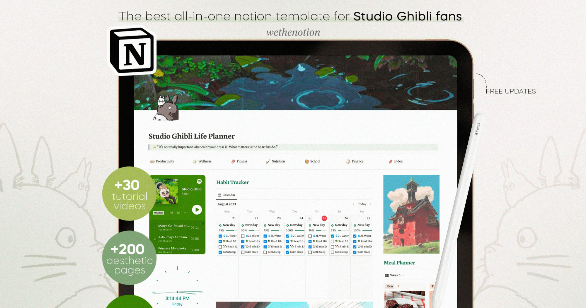 The Studio Ghibli Life Planner is a magical, whimsical Notion template that combines productivity with aesthetic charm. Inspired by the beloved Studio Ghibli films, this dashboard makes planning and organizing feel creative and enjoyable.