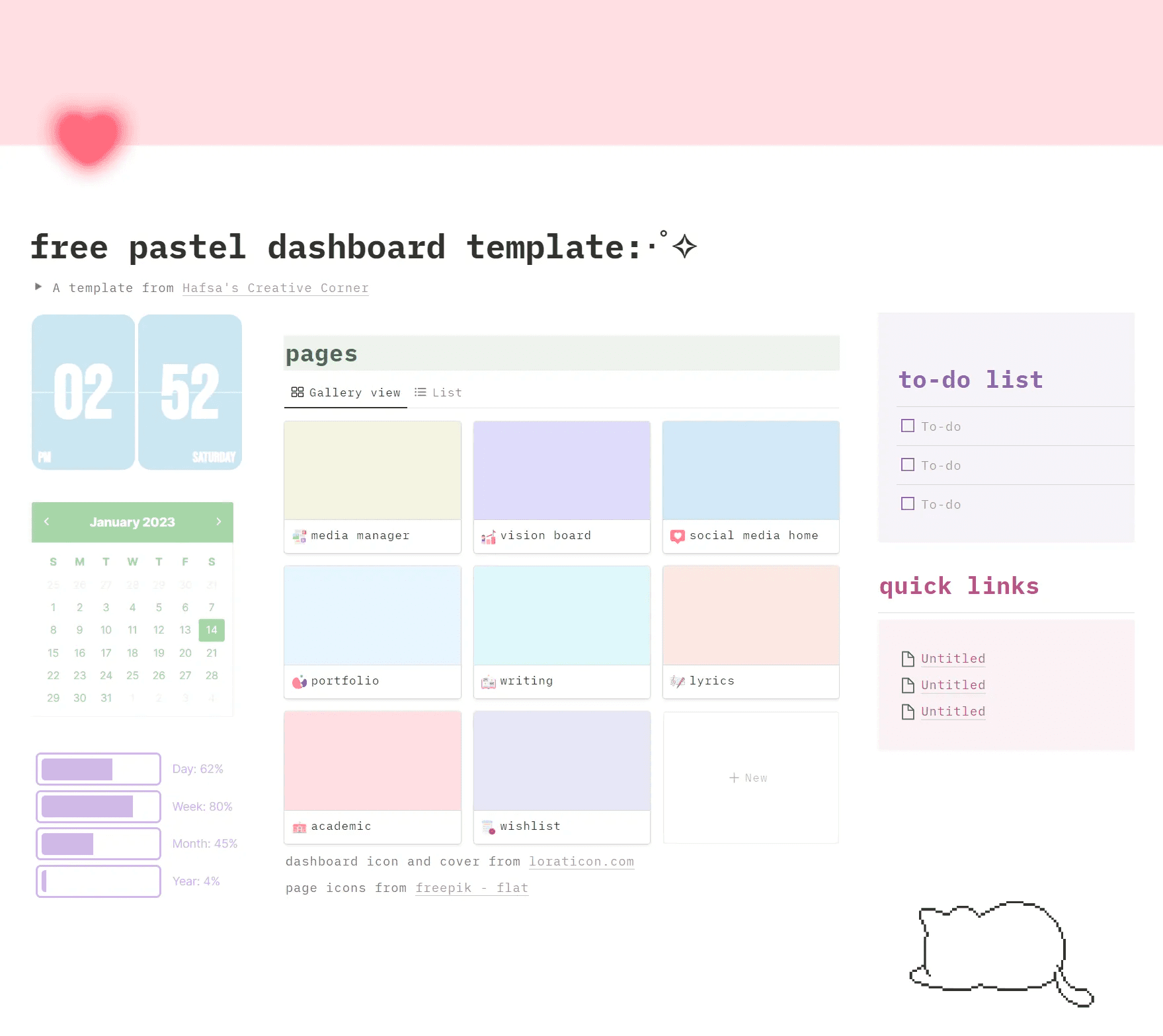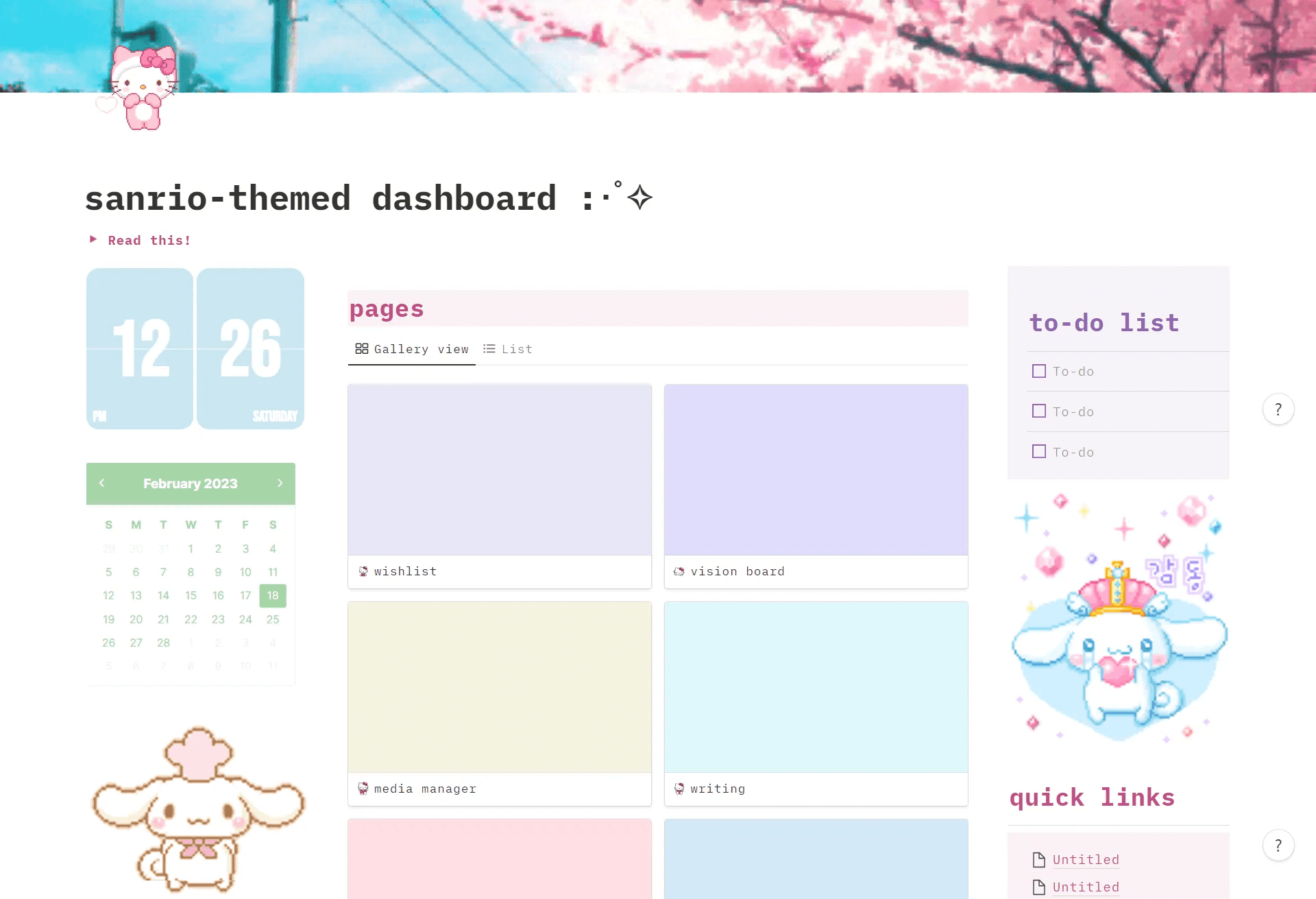 Organize your digital life with charm using the Pastel Notion Dashboard Template, featuring a cute Hello Kitty theme and soft color palette. Ideal for lifestyle planning and visual thinkers, this dashboard blends aesthetic beauty with simple functionality.