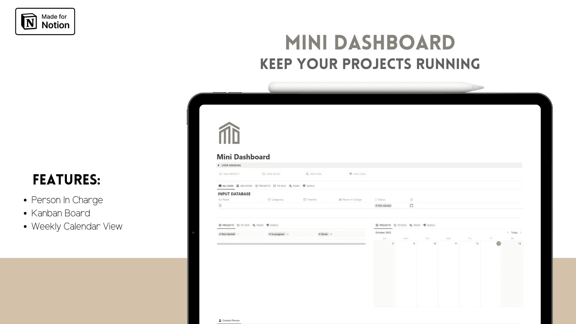 Simplify your project and task management with the Notion Mini Dashboard—a minimalist and highly efficient productivity system designed for clarity and speed. Ideal for managing group projects, this template provides a sleek interface and essential features to keep your goals, tasks, and responsibilities on track.