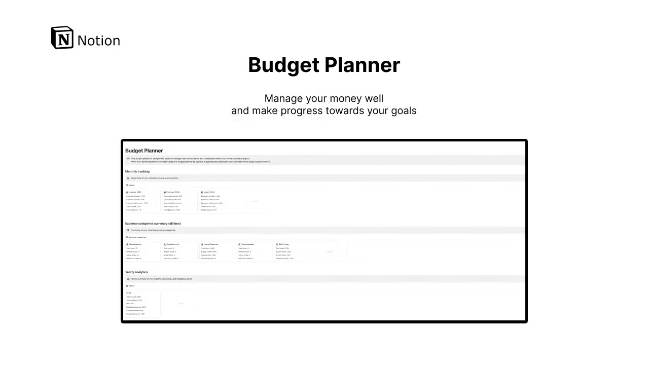 The Budget Planner Notion template is designed to help you effectively manage your income and expenses, ensuring you stay aligned with your budgetary objectives: