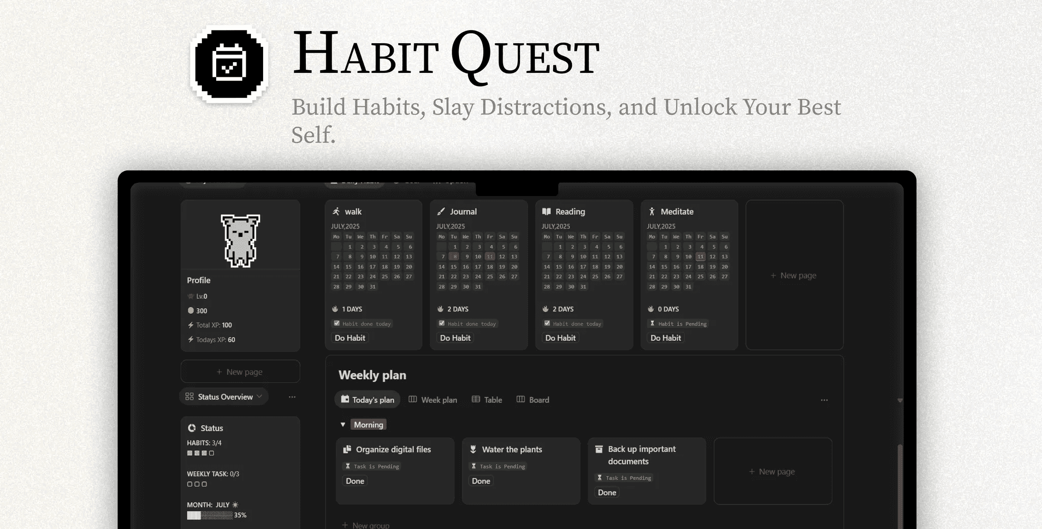 Habit Quest transforms habit tracking into an RPG-style experience, making habit building more engaging through character progression, XP rewards, and structured planning.