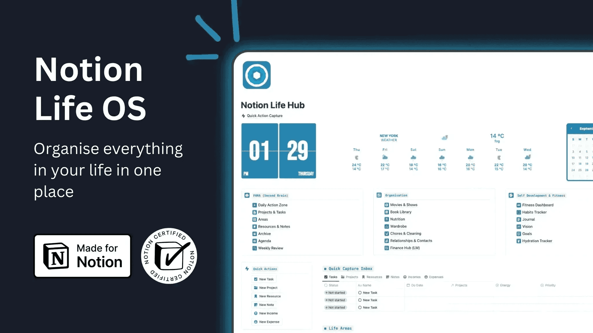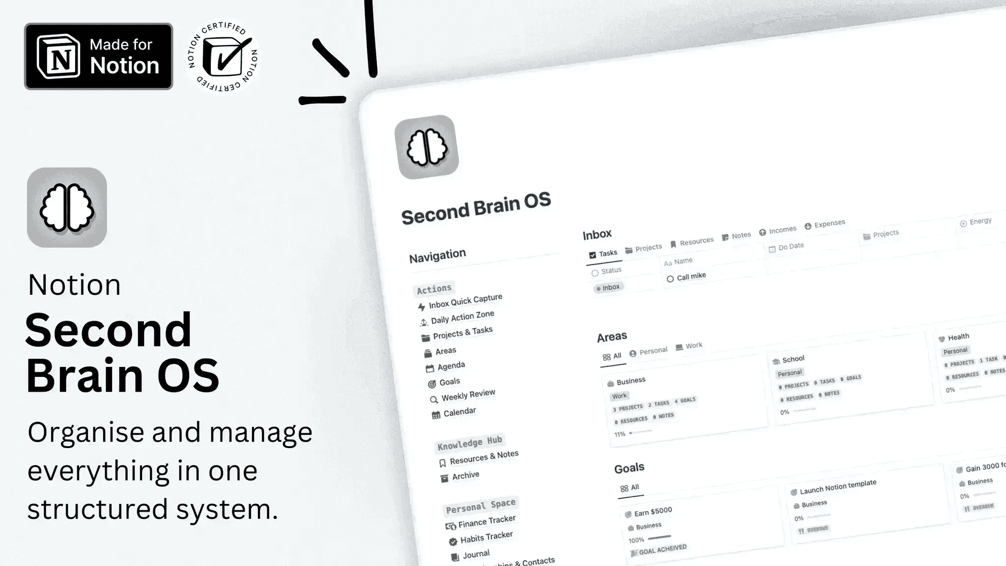 Organize your life and reach your goals with the Notion Second Brain OS — a robust Notion goal setting and productivity system built on the PARA and GTD frameworks. Capture ideas, manage tasks, and plan projects with a unified dashboard designed for maximum focus and efficiency.