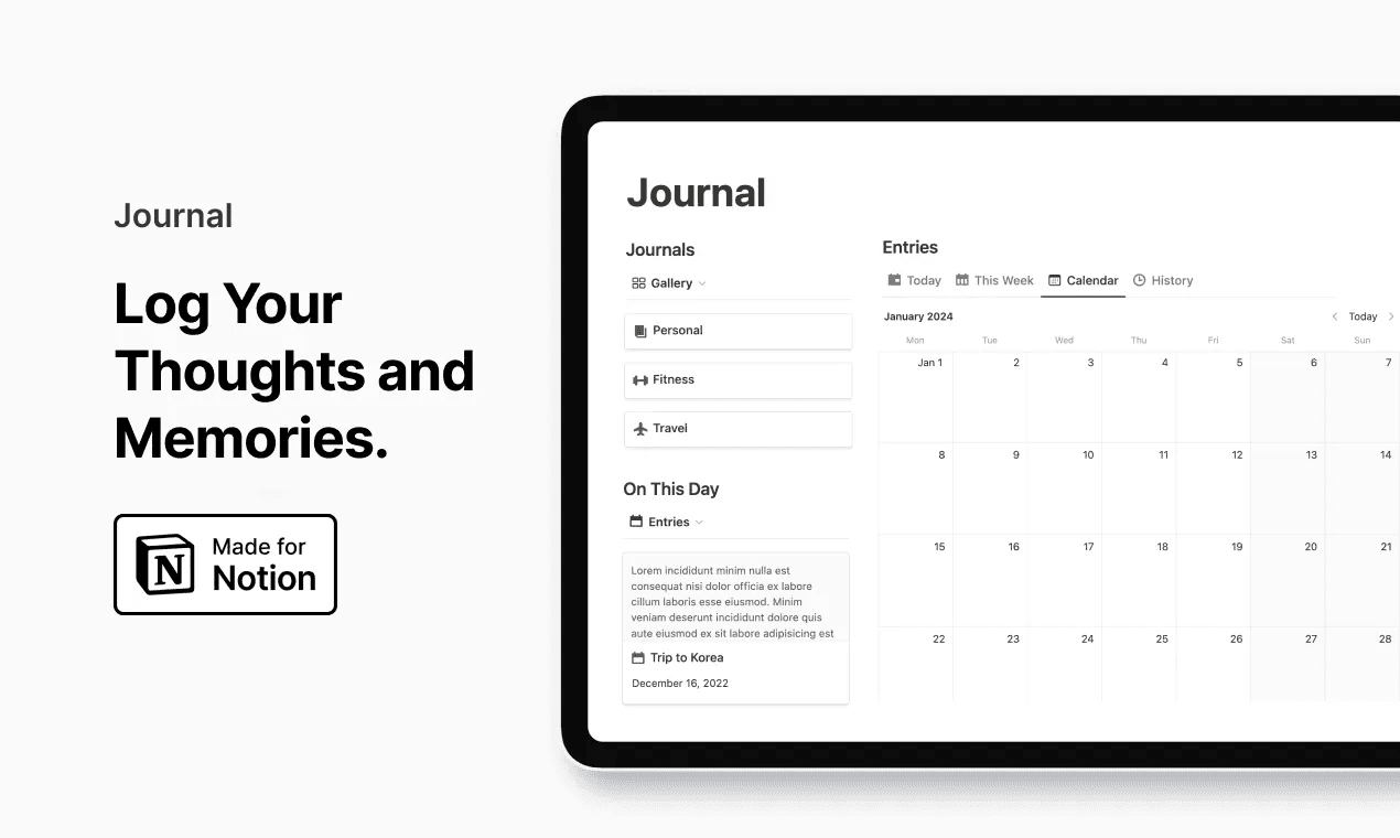 Capture memories, reflections, and personal growth with the Notion Journal — your all-in-one digital diary for daily journaling, fitness logs, and travel experiences. This template is designed for anyone who wants to track their life moments, organize reflections, and revisit past entries anytime.