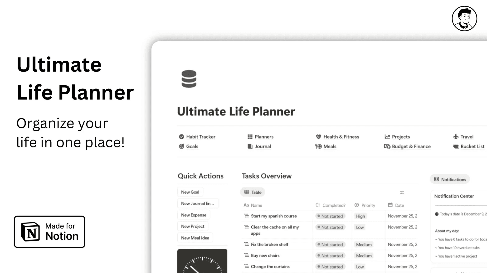 The Notion Ultimate Life Planner is a customizable life planning template designed to improve productivity, wellness, and personal growth. It helps you plan your days while keeping all life areas connected.