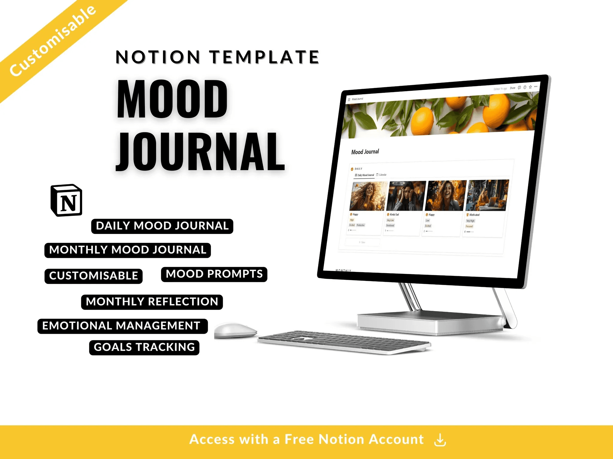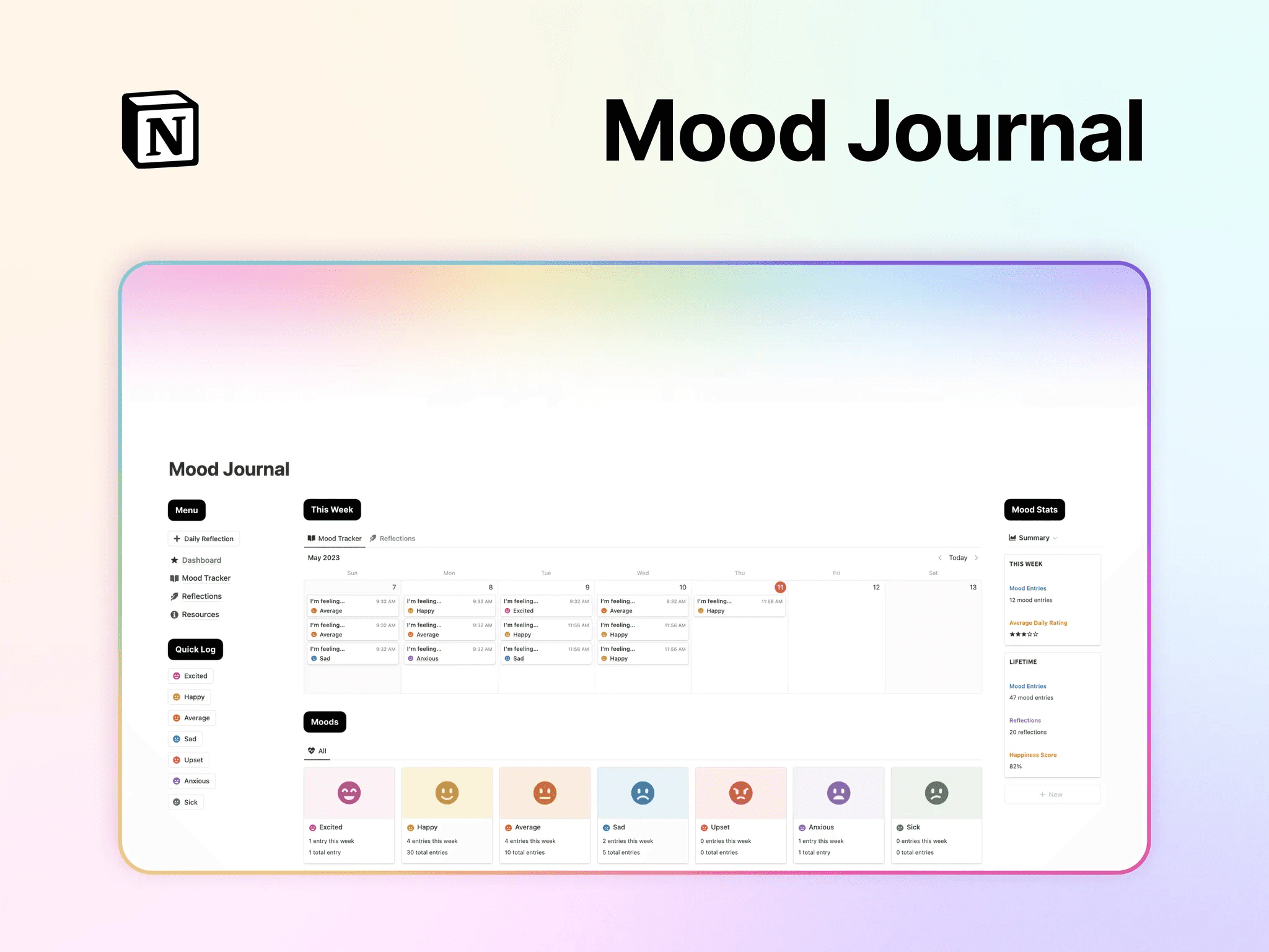 The Notion Mood Journal is a flexible and powerful emotional tracking tool designed to adapt to your daily routine. Each entry is automatically organized into daily, hourly, and monthly views, giving you a clear overview of your emotional journey.