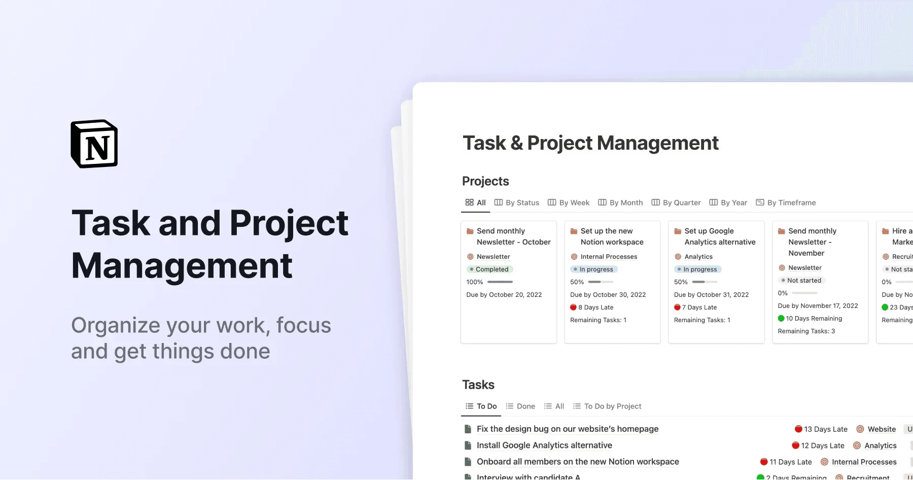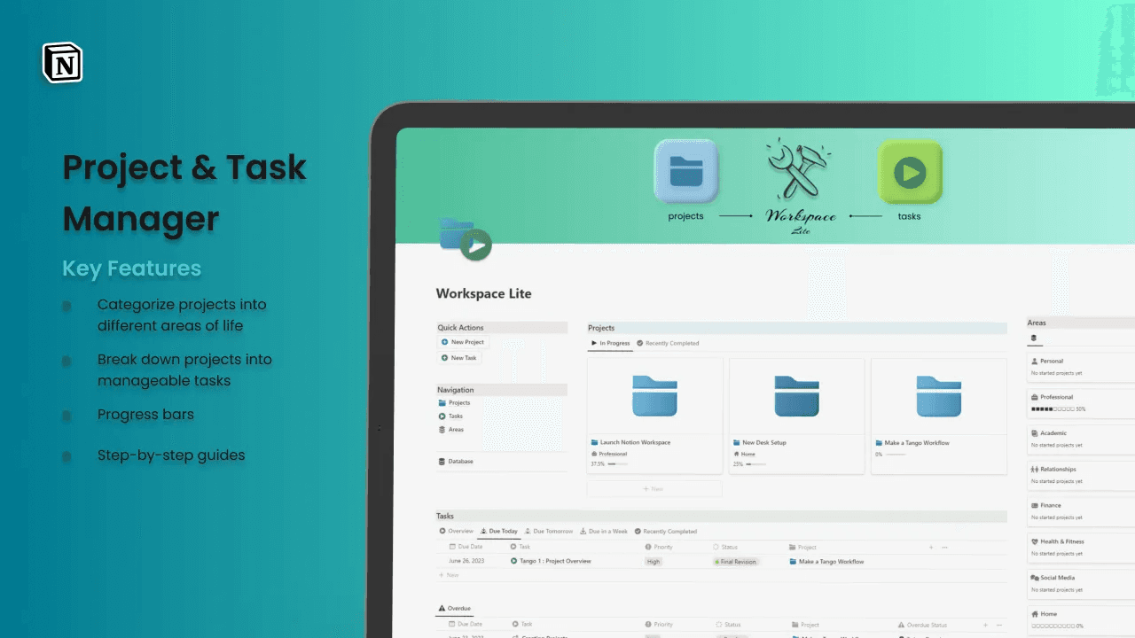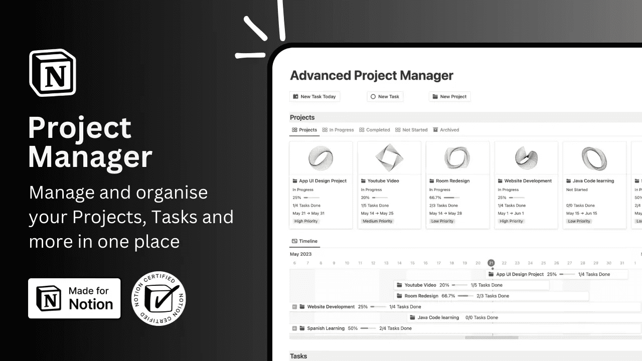 Turn Notion into a powerful project management app with this advanced Notion Project Management Template. Manage daily tasks, large projects, and team workflows with 30+ database views, auto-generated dashboards, focus views, and more—perfect for personal and business use!