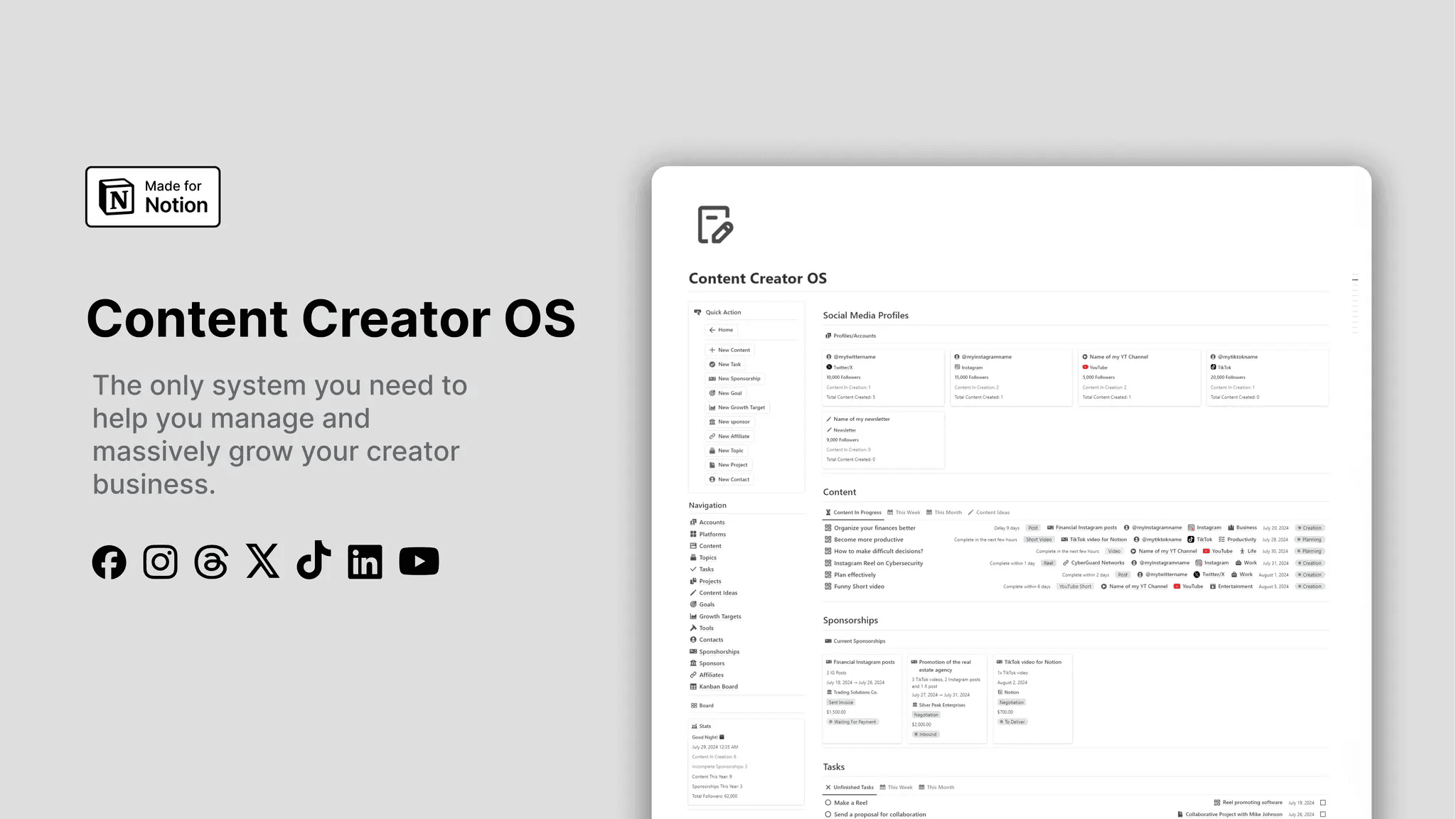 Notion Content Creator OS is an all-in-one Notion content management system for creators that helps you plan, create, schedule, and track social media content from a single dashboard. It’s ideal for creators managing multiple platforms, growth goals, sponsorships, and collaborations.
