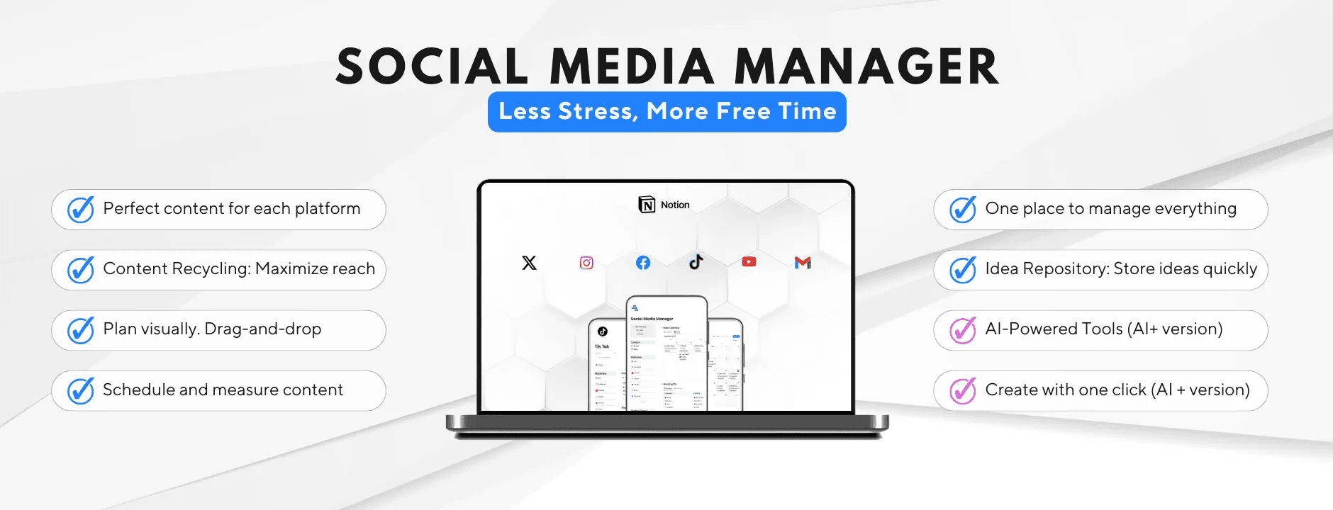 Social Media Manager is a flexible Notion social media management template built to organize content workflows, scheduling, collaboration, and platform-specific strategies in one unified system.