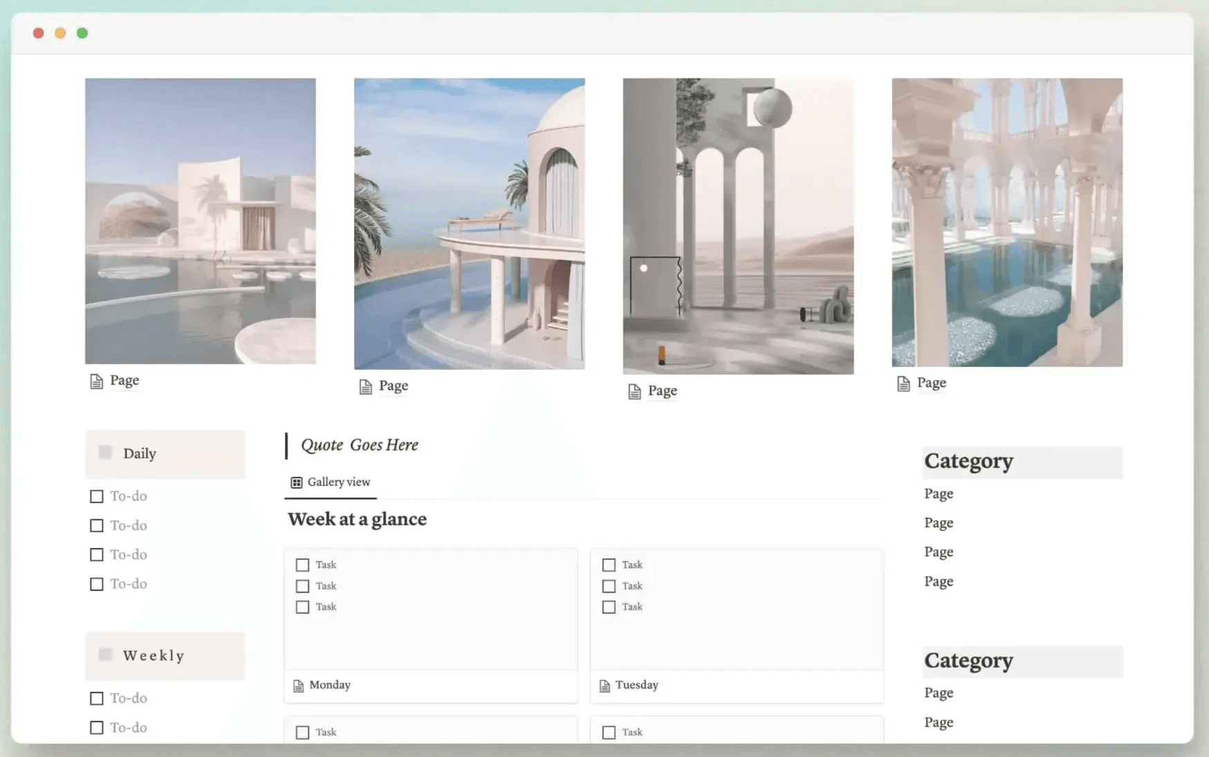 Bring the classic sticky notes experience into Notion! While Notion doesn’t have native sticky note blocks, this Sticky Notes Dashboard recreates them using colorful callout blocks. It also includes a task database to help you stay on top of your to-dos.