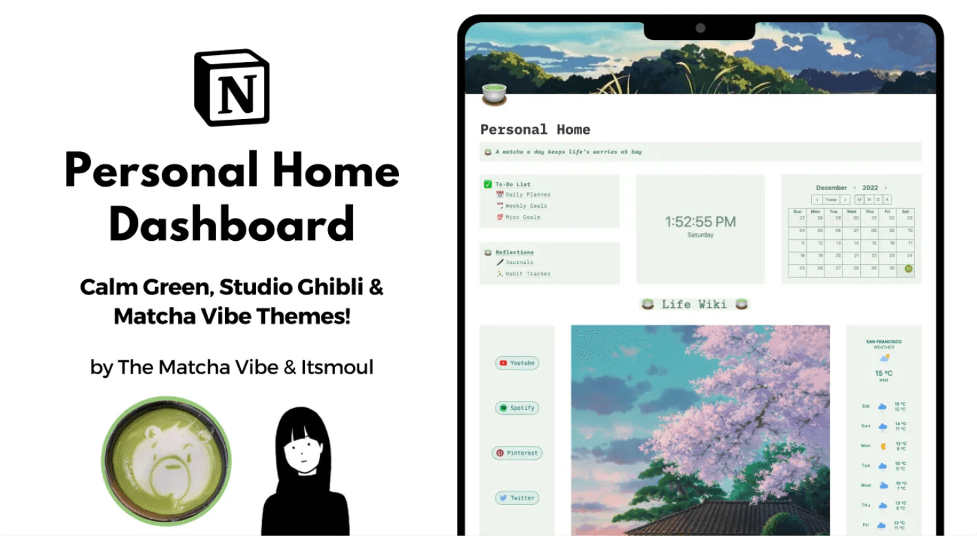This cozy and inviting aesthetic home dashboard is perfect for anime lovers and those who enjoy a kawaii-inspired setup. It includes delightful GIFs and an integrated Spotify playlist to enhance your Notion experience.