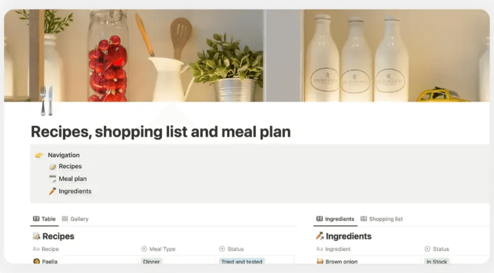 The Notion Meal Planner helps you plan meals, manage recipes, and organize shopping lists in one simple dashboard.