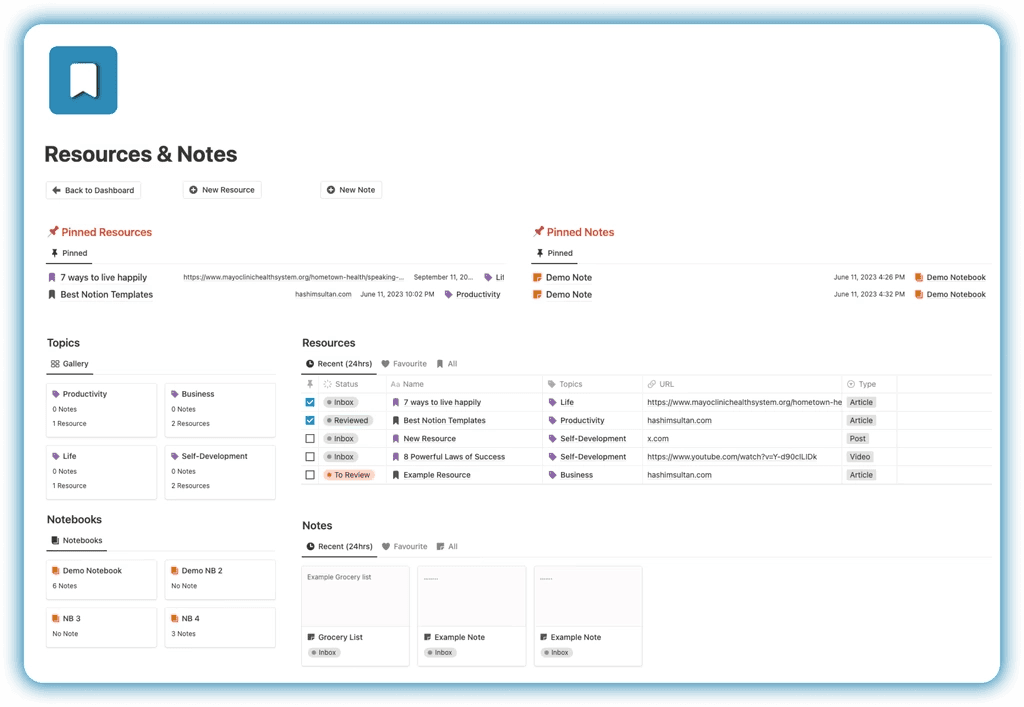 The Resources & Notes system inside Notion Life OS allows you to capture, organize, and manage all your digital knowledge in one structured workspace. Instead of saving valuable content across multiple apps, tabs, or bookmarks, you can centralize everything into a clean and searchable knowledge management system.