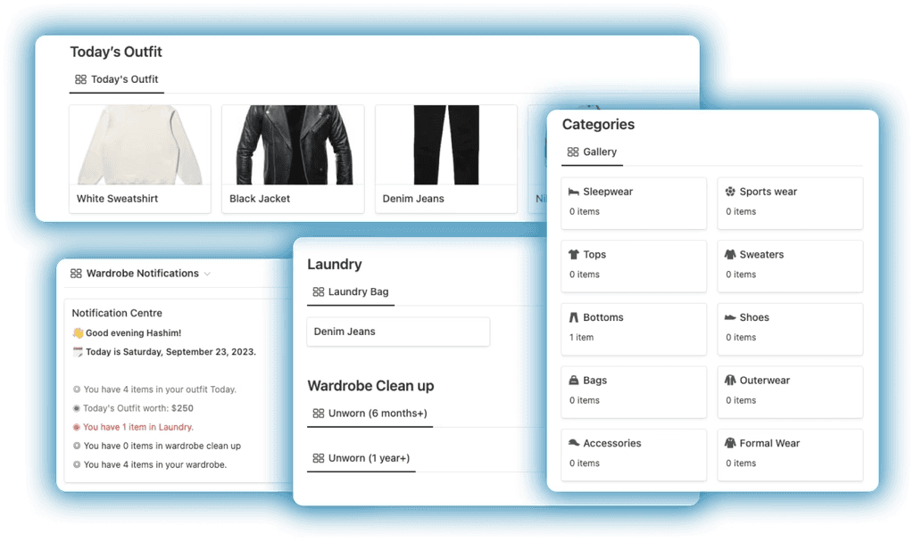 The Wardrobe Manager inside Notion Life OS allows you to create a complete digital inventory of your wardrobe, helping you organize clothing, plan outfits, and manage laundry efficiently. Instead of guessing what to wear or forgetting what you own, everything is stored and categorized in one structured Notion dashboard.