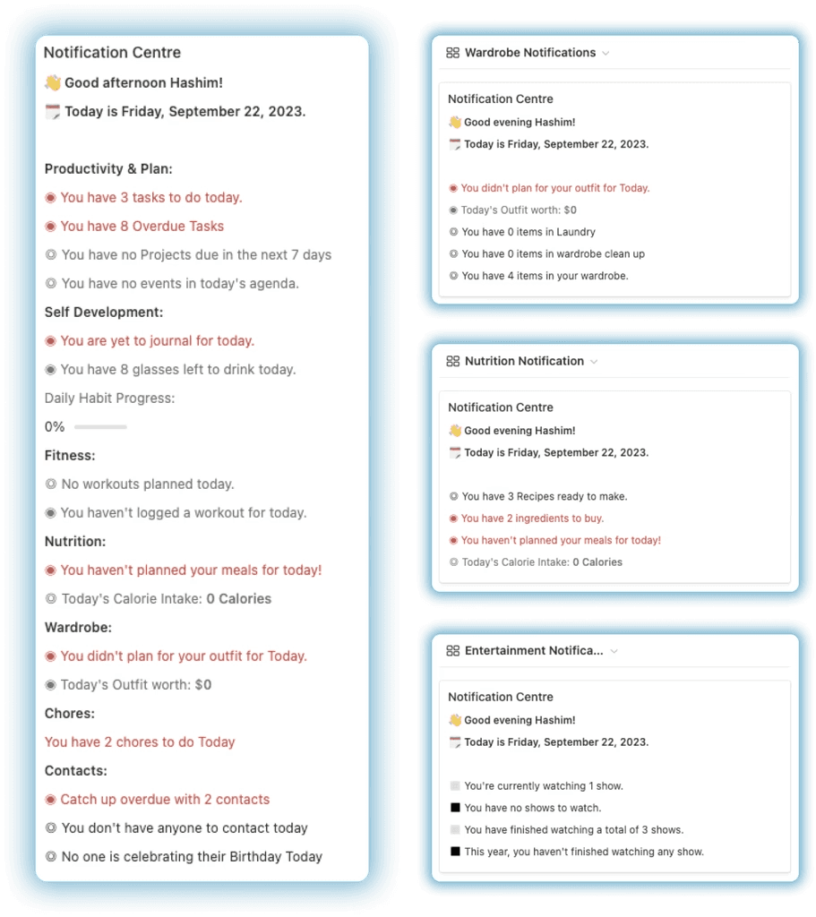 Experience one of the most advanced features inside Notion Life OS — the Dynamic Notification Centre. This powerful productivity hub acts like a built-in personal assistant, ensuring you stay informed, focused, and in control of your entire workspace.