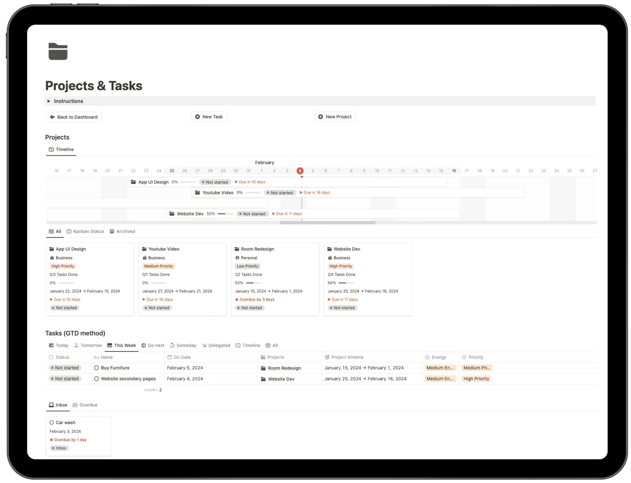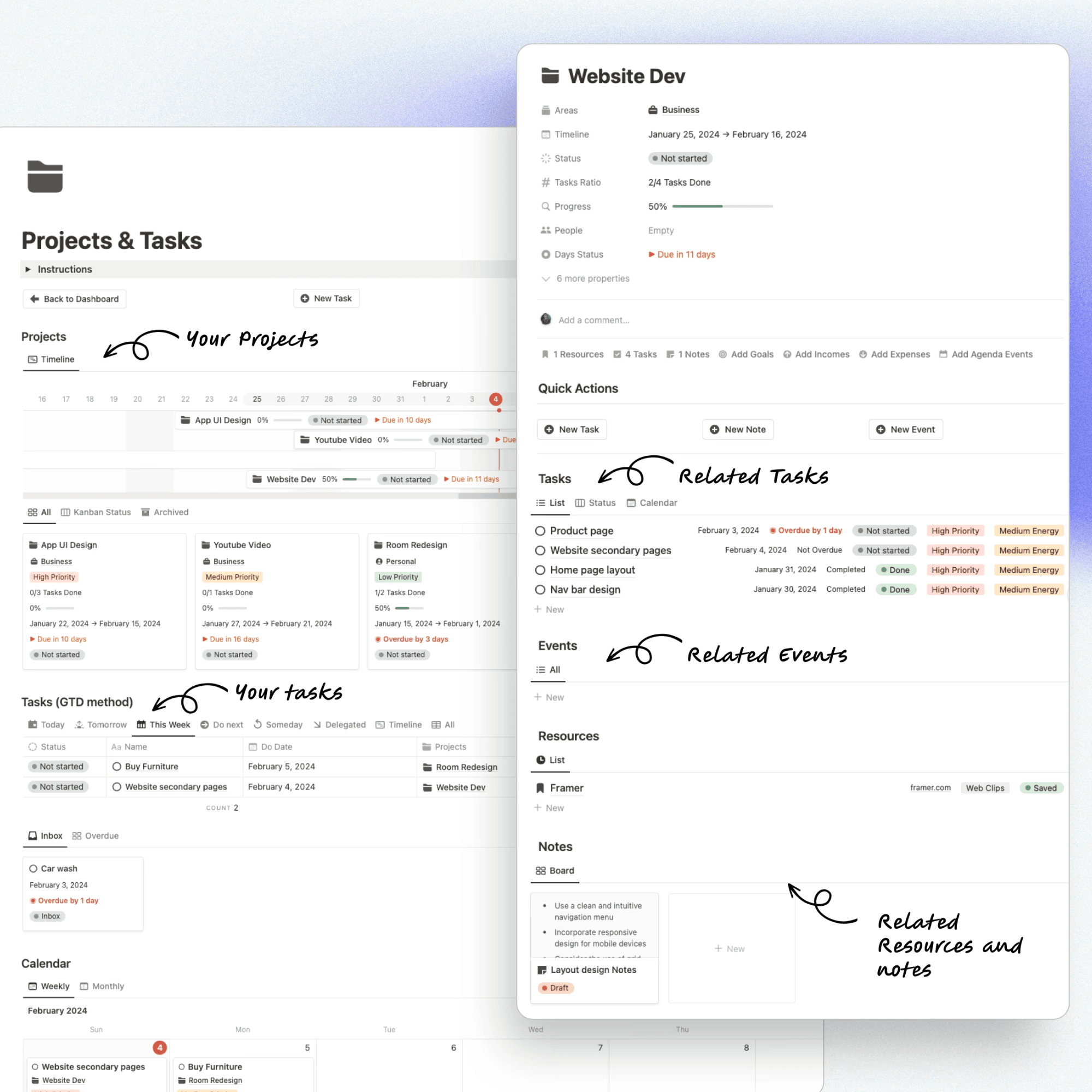 You can manage multiple projects with timeline visualization, priority levels, progress indicators, and automatic deadline tracking. The integrated GTD-based task manager allows you to organize tasks by Today, This Week, Upcoming, or Inbox, while linking every task directly to its parent project for complete clarity.