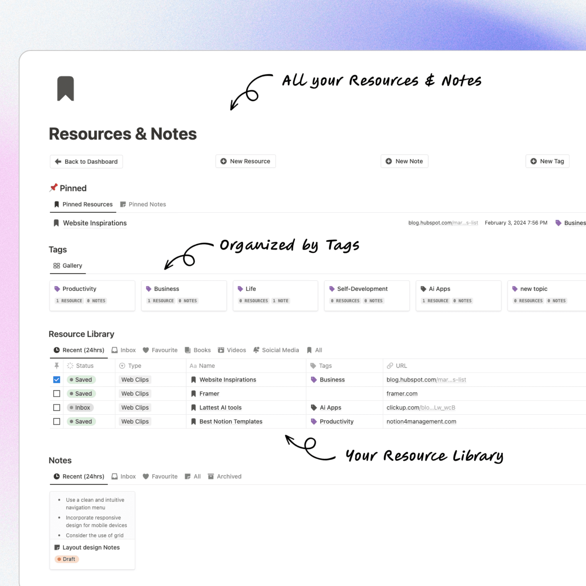 The Resources and Notes section inside the Second Brain OS is your centralized knowledge management system in Notion, designed to help you capture, organize, and retrieve valuable information effortlessly. Whether you're saving web links, business research, study materials, AI tools, or personal insights, everything is stored in one structured digital library.