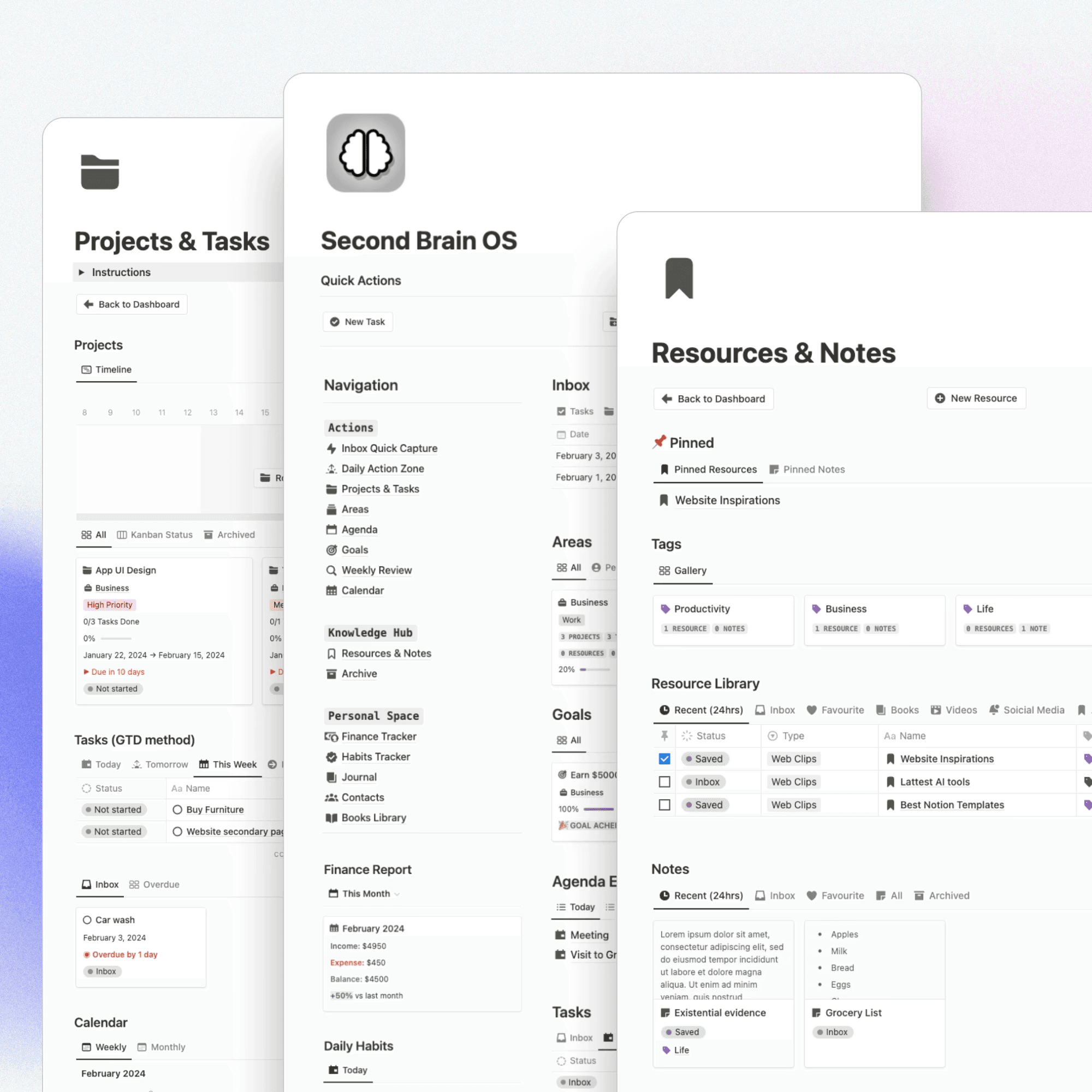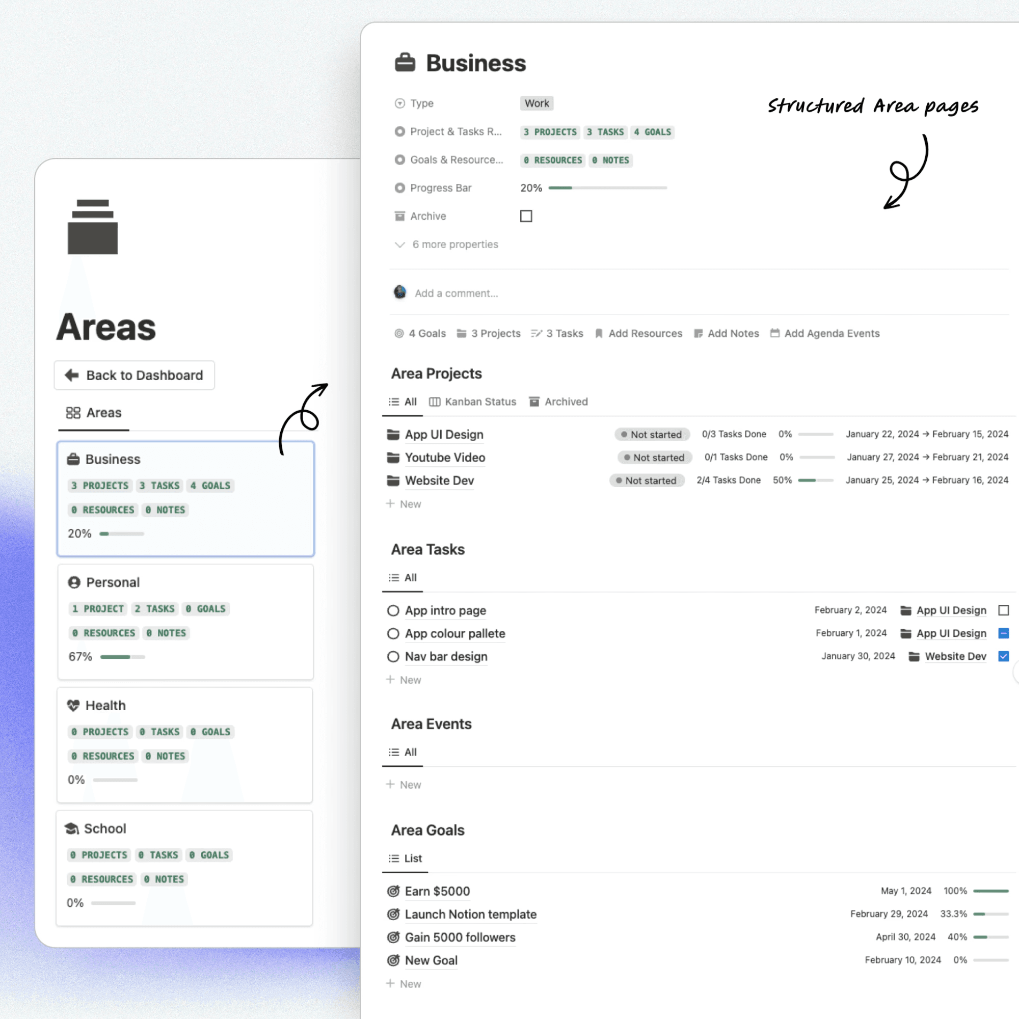 By organizing your life into structured Area pages, you create clarity between long-term responsibilities and short-term projects. This system helps you balance work, personal growth, health, education, and side hustles, all inside one integrated Notion Second Brain designed for efficiency, focus, and sustainable productivity.