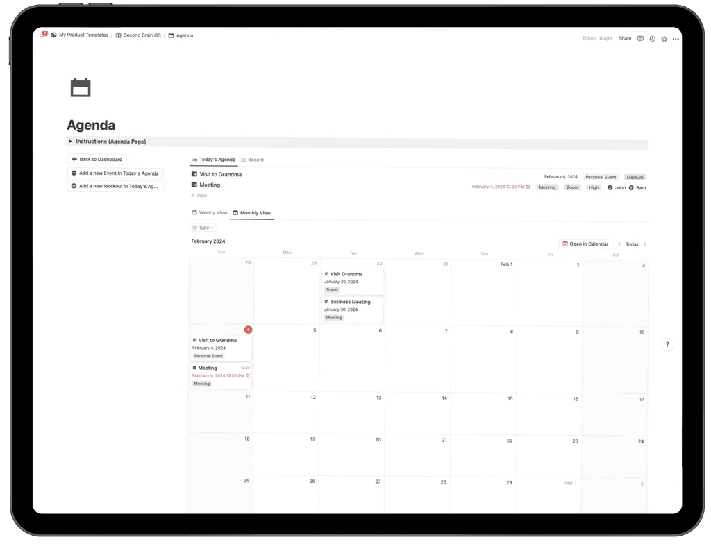 The Agenda Events section in the Second Brain OS is a fully integrated Notion calendar and event management system designed to help you schedule meetings, plan appointments, and organize important events with complete clarity.