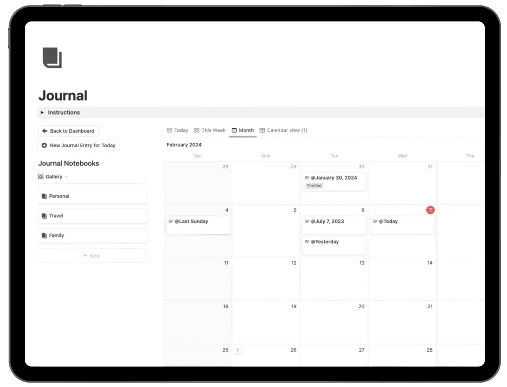 The Journal section inside the Second Brain OS is a structured digital journaling system built in Notion to help you document your thoughts, experiences, goals, and personal growth in one organized space.