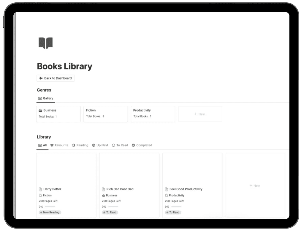 You can categorize books by genre (Business, Fiction, Productivity, and more), track reading status (To Read, Reading, Up Next, Completed), and monitor progress with page counts and completion percentages. The organized gallery views allow you to quickly filter favorites, active reads, and finished books for a streamlined reading workflow.