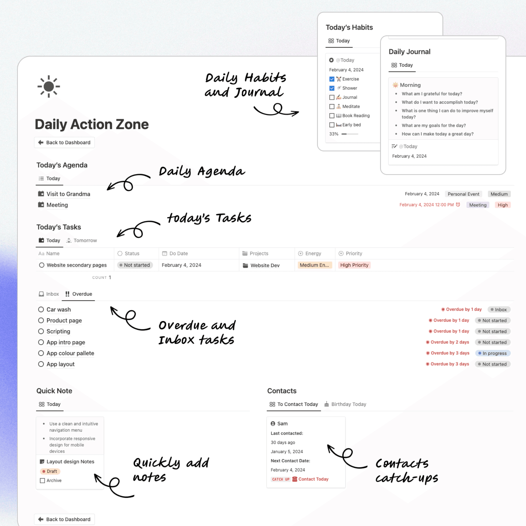 By consolidating tasks, calendar events, habit tracking, journaling, notes, and contact management into one streamlined daily command center, the Daily Action Zone reduces overwhelm and eliminates context switching. It ensures your daily actions align with your long-term goals inside your fully integrated Notion Second Brain system.