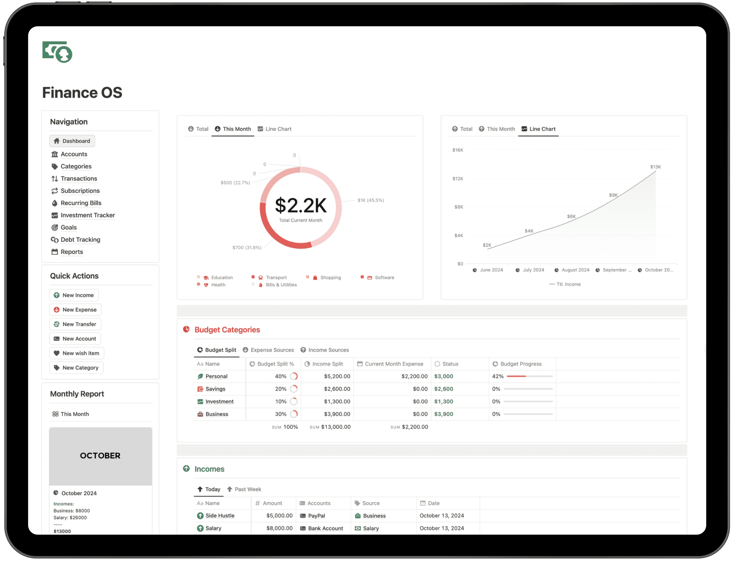Finance OS allows you to effortlessly track your income, expenses, budgets, and financial goals all in one place.