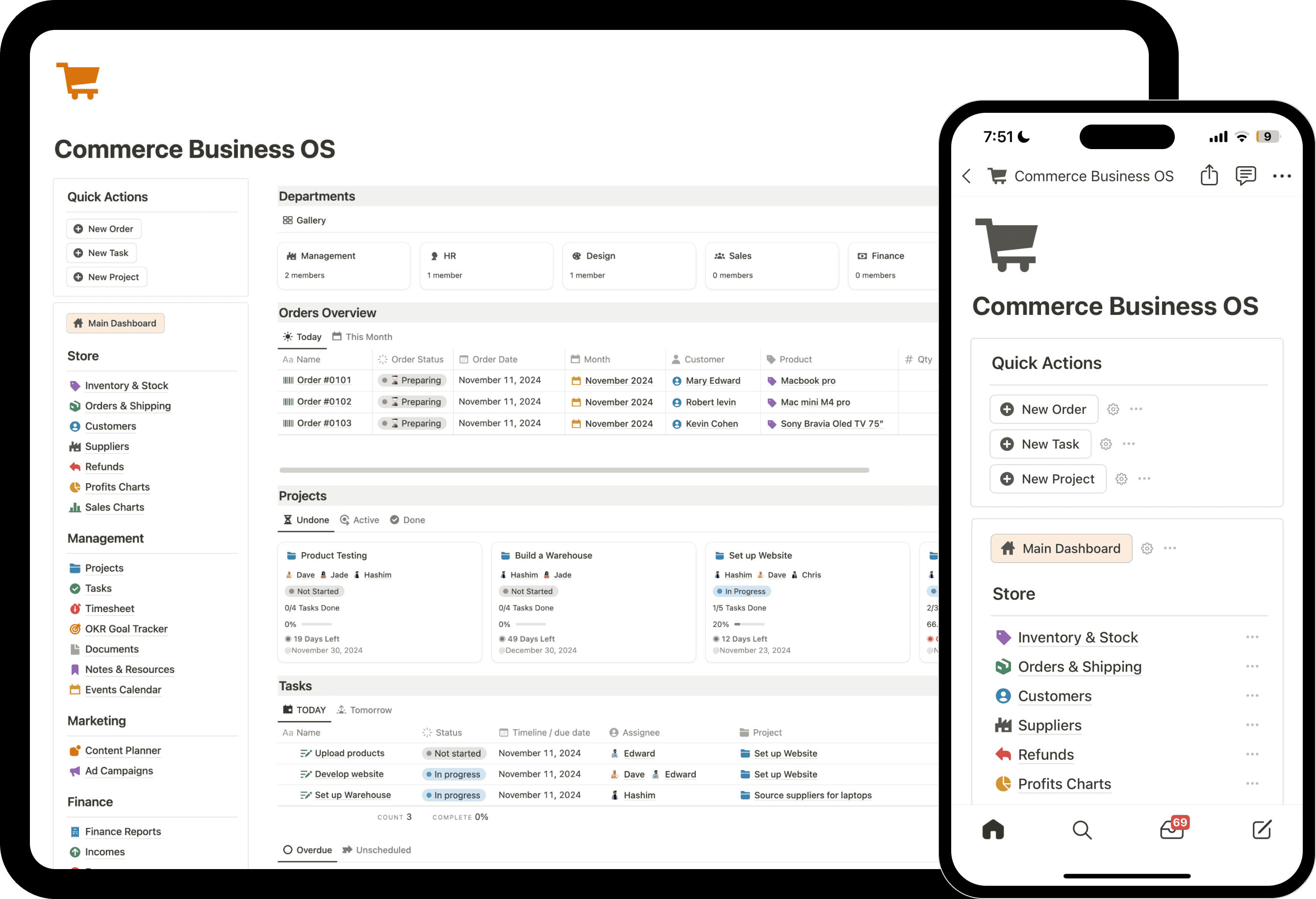The Ultimate Commerce Management Notion Template, expertly designed to manage your inventory, orders, finances, team, and marketing—all in one organized workspace.